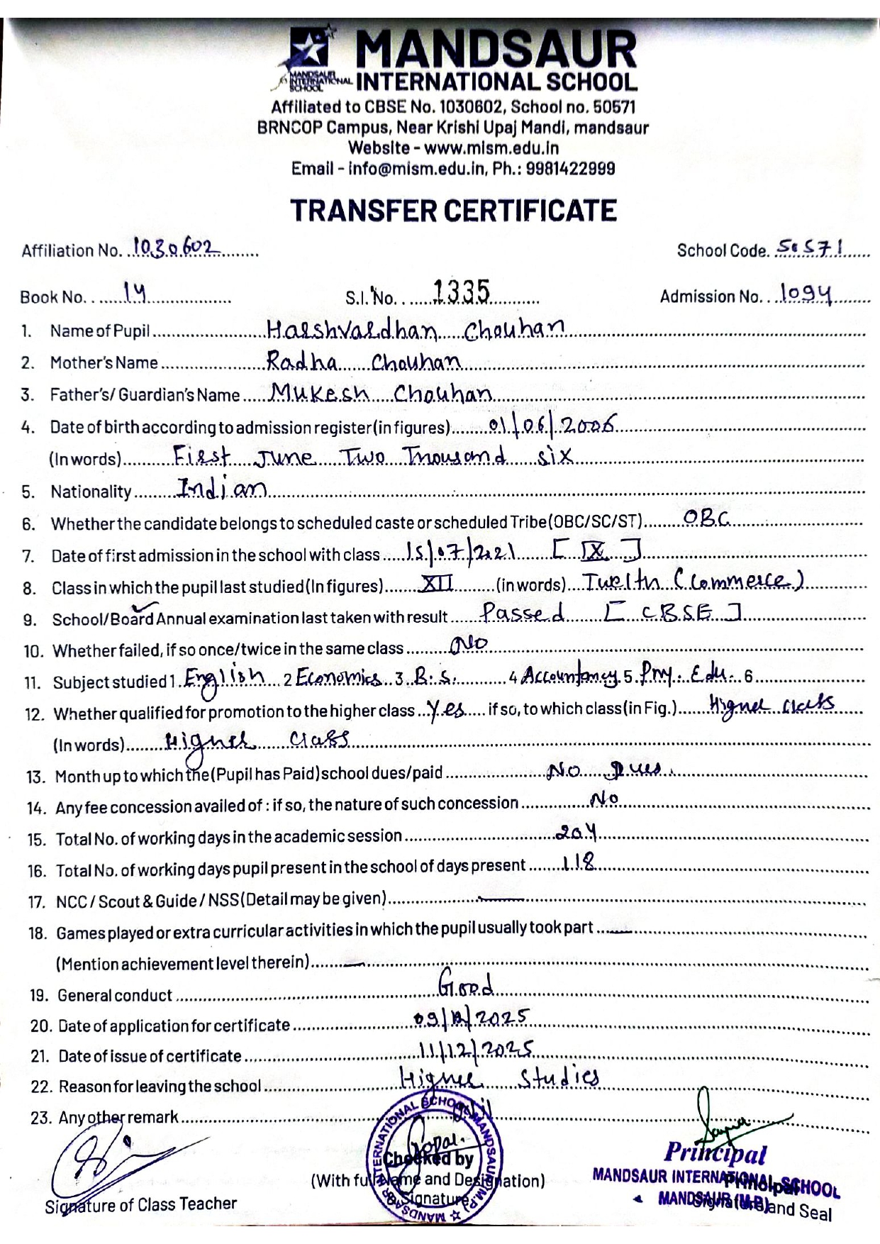 | Session 2024-25 | Class 12th Transfer Certificate | Harshvardhan chouhan |