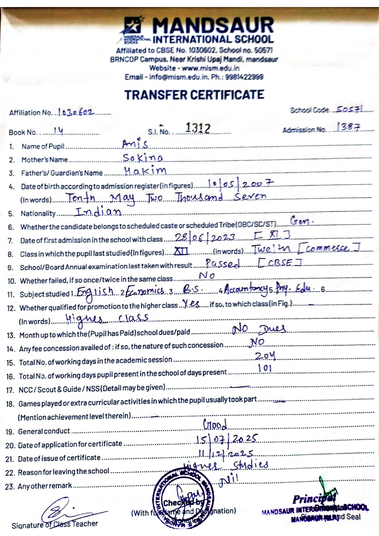 | Session 2024-25 | Class 12th Transfer Certificate | Anis |